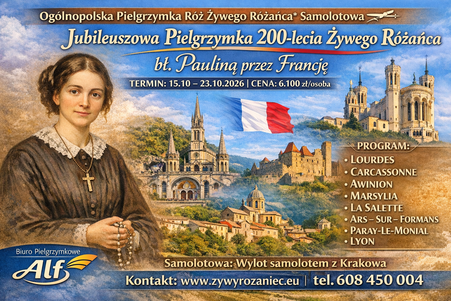 Nasza parafia organizuję pielgrzymkę samolotową w październiku przez najważniejsze Sanktuaria i miejsca we Francji z okazji 200 – lecia Żywego Różańca. Program bardzo bogaty i ciekawy. ( Sanktuaria: Lourdes, - CARCASSONE – AWINION, MARSYLIA – SAINT MAXIMIN – AIX EN PROVENCE, LA SALETTE, ARS, SUR, FORMANS, PARAY LE MONIAL, LYON miasto rodzinne Pauliny Jaricot w...
