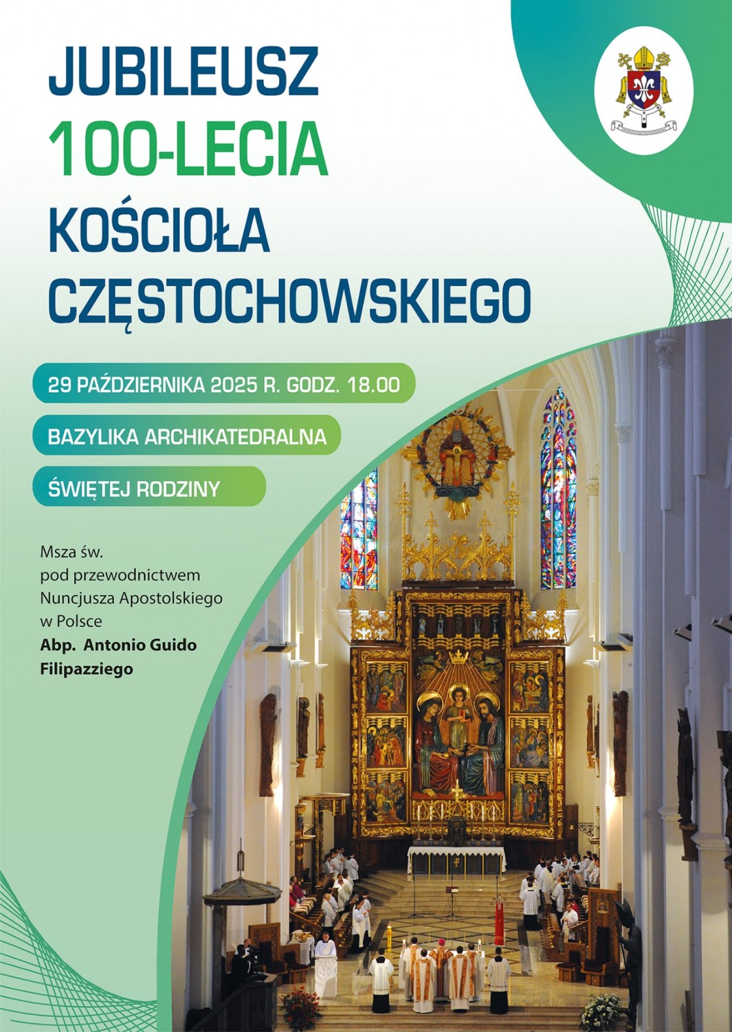 W tym roku mija 100 lat od powołania diecezji częstochowskiej bullą Vixdum Poloniae Unitas papieża Piusa XI. Jest to powód do wielkiej wdzięczności Bogu za ten Kościół, który współtworzymy. Centralne uroczystości jubileuszowe będą miały miejsce w środę, 29 października 2025 r. w Bazylice Archikatedralnej w Częstochowie (ul. Krakowska 15/17). W tym dniu Mszy Świętej o godz. 18.00 przewodniczyć będzie Arcybiskup Antonio Guido Filipa...