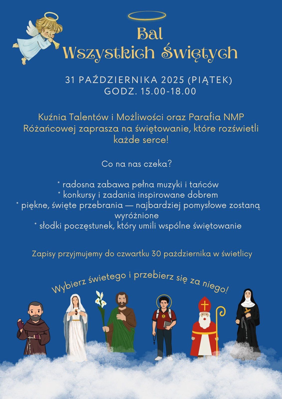 Parafia NMP Różańcowej i Kuźnia Talentów i Możliwości zaprasza na Bal Wszystkich świętych, który odbędzie się 31.X,20225 roku w godz. 15.00-18.00. Szczegóły na plakacie. Zgłoszenia w świetlicy.